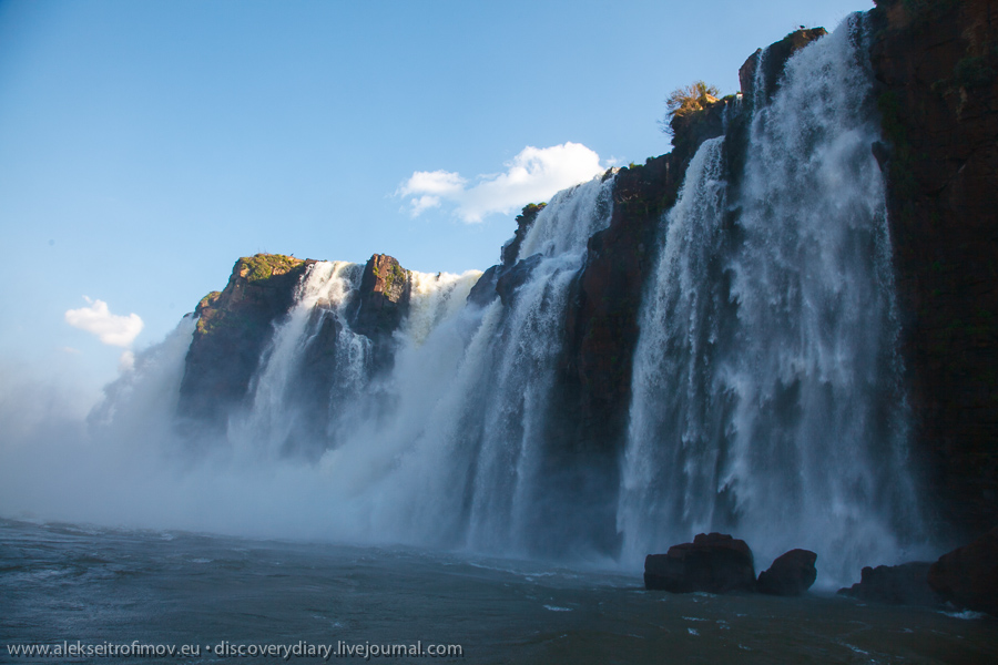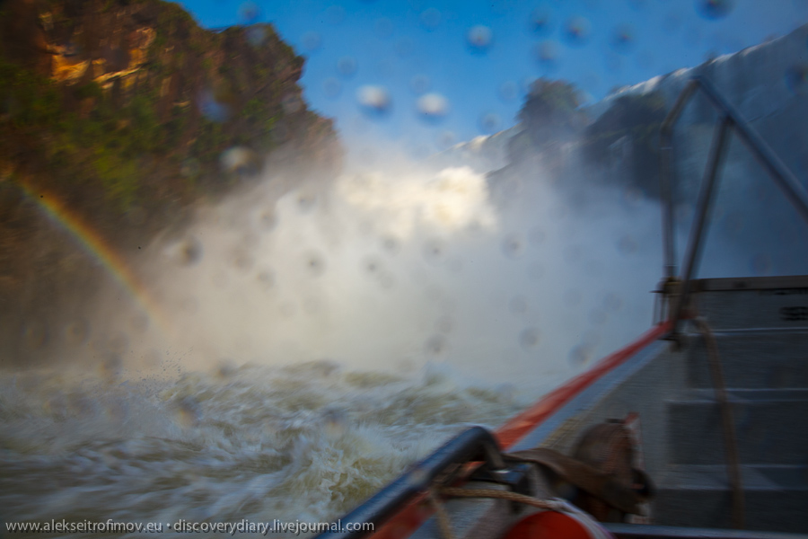 I chose to sit in the first raw on the boat. This was on purpose. The boat not just approaches the falls, it actually enters it (although I didn’t quite imagine it was this drastic). This is quite something. Everybody is shouting like crazy, the boat goes up and down like a Russian mountain, the water simply falls at you from above. I looked up at those moments. It’s not every day that you can observe the Iguazu falls from inside!