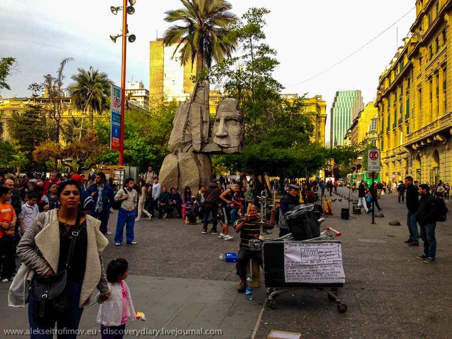 On the main square of Santiago, inevitably called Plaza de Armas, there are two statues. One is the statue of don Pedro on a horse; the statue at the other end of the plaza is this one – in the form of a deconstructing face of a Mapuche Indian, symbolising their tragic destiny. Plaza de Armas though is a very fun place, always full of people, clowns, guides, chess players and dancers.