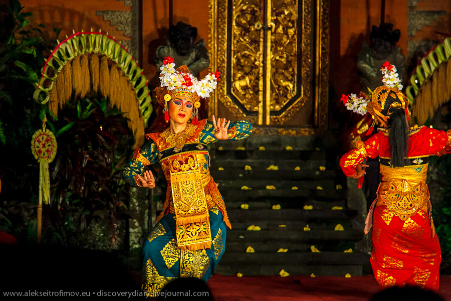 On my very first night in Ubud I set off for the Royal palace which hosted a traditional legong barong dance. When I arrived about 10 minutes before the start, almost all the seats behind the starry sky were already taken, so I had to photograph over the heads of those sitting in front of me. Surprisingly there were quite a few local spectators too, in addition to tourists, though the locals were mostly watching from behind, probably as friends of performers.
